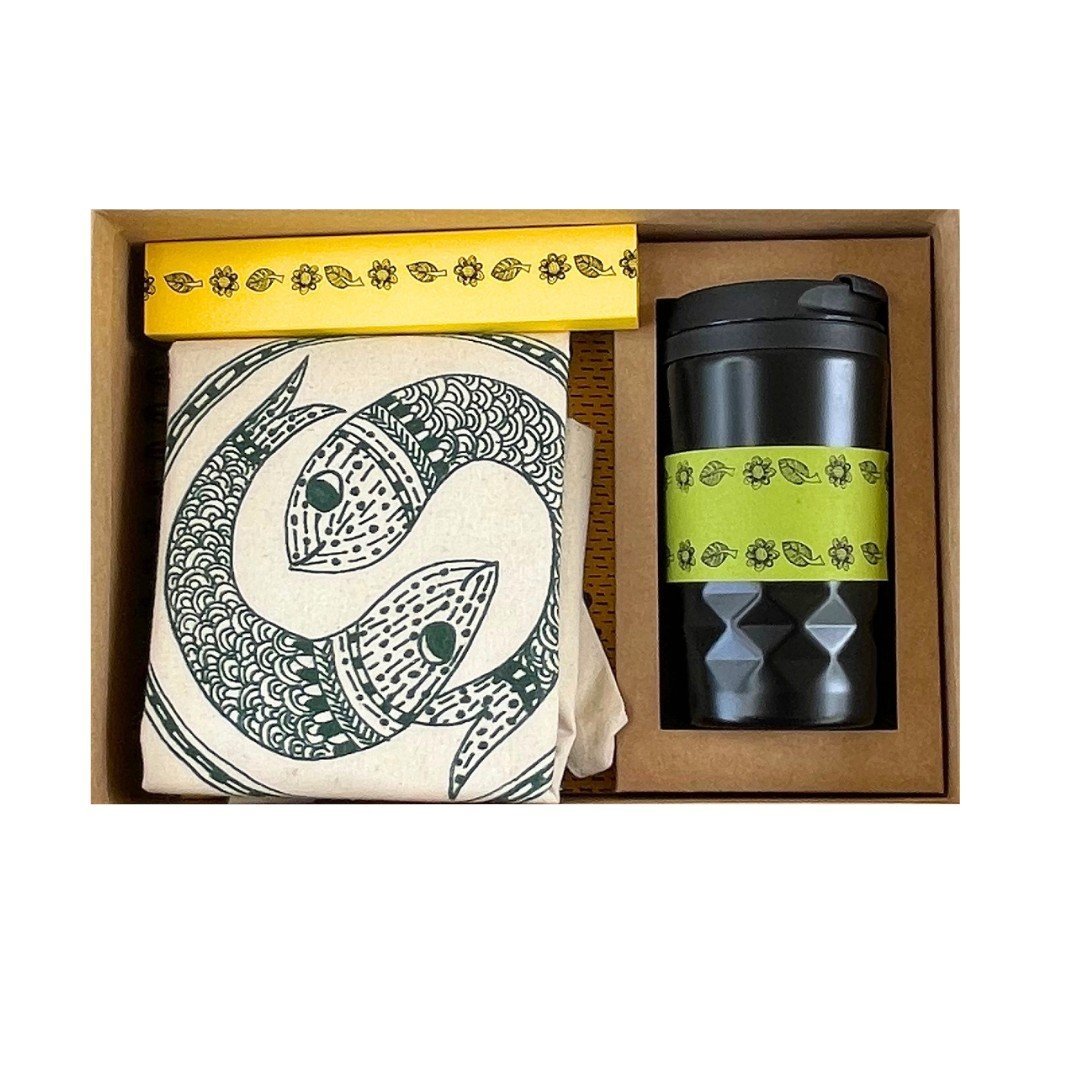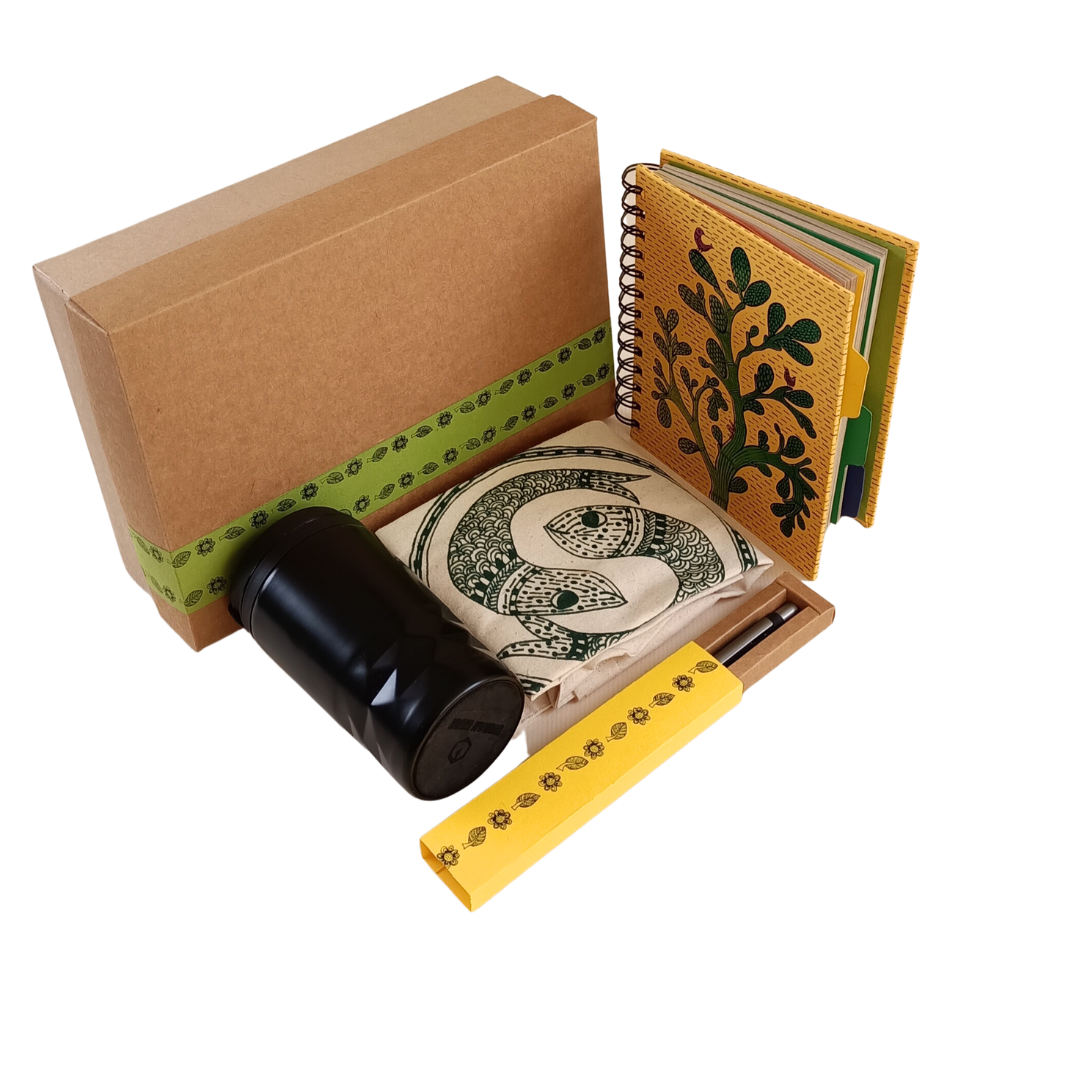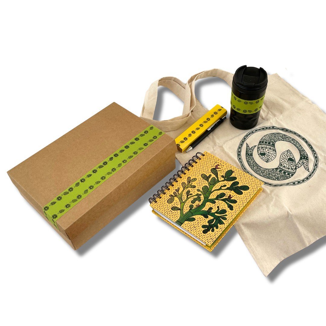 This gift set is inspired by the beauty of Gond art. Neatly packaged in an elegant and earthy box, it comes complete with a spiral notebook which flaunts 4 colorful section separators and beautiful recycled paper for you to make notes in, a stainless steel mug with an airtight lid to ensure your beverage remains hot or cold for a longer period of time, a pen enclosed in a pretty box, and a beautiful cotton tote bag that is sure to become your go-to companion on your every shopping spree.