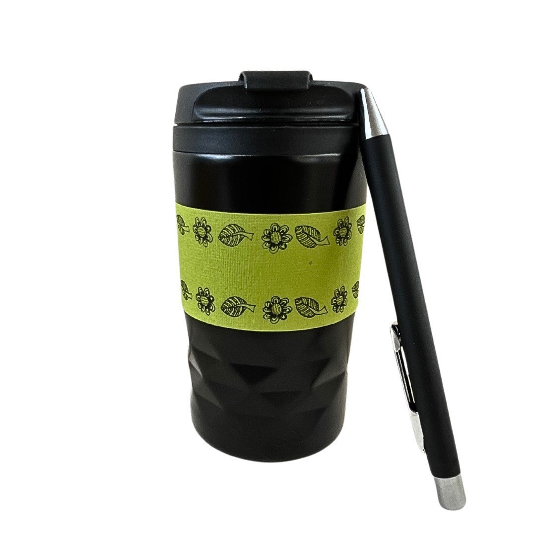 Spiral notebook – 160 pages, Stainless steel mug with lid, pen and cotton tote bag.