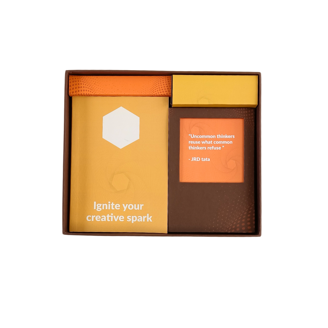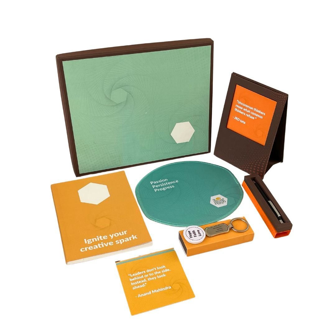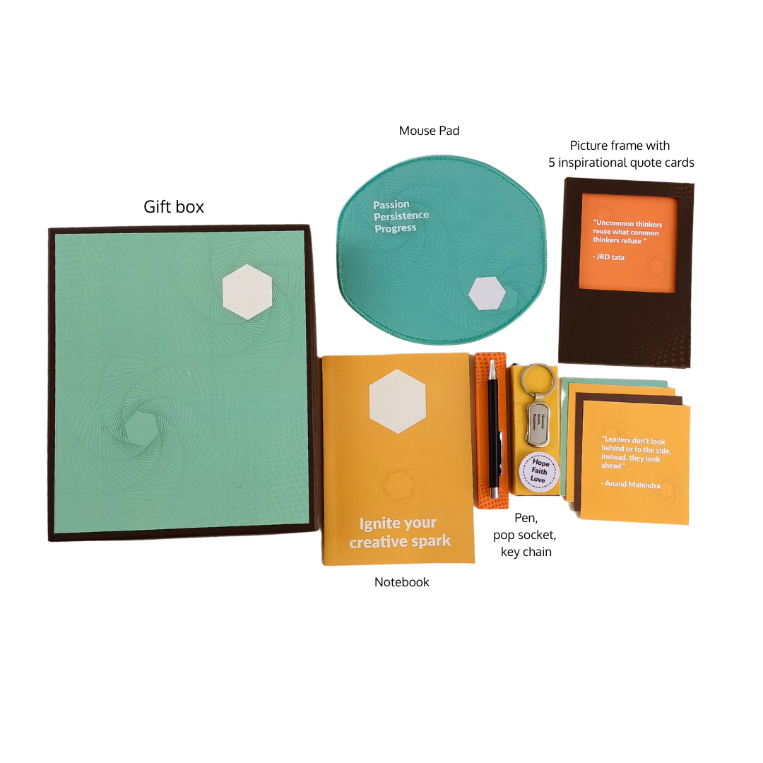 Enjoy fantastic, uplifting and heart warming quotes on life by famous Indian visionaries, allow the mouse pad to be a gentle reminder to stay inspired through all the work you do, enjoy sharing your ideas in the well designed journal, giving you space to doodle, write or simply jot what comes to mind, carry the language of inspiration on your phone, flaunt the key chain and create small moments of joy each day. Share this gift with team mates and your clients and watch them light up as they feel inspired too!