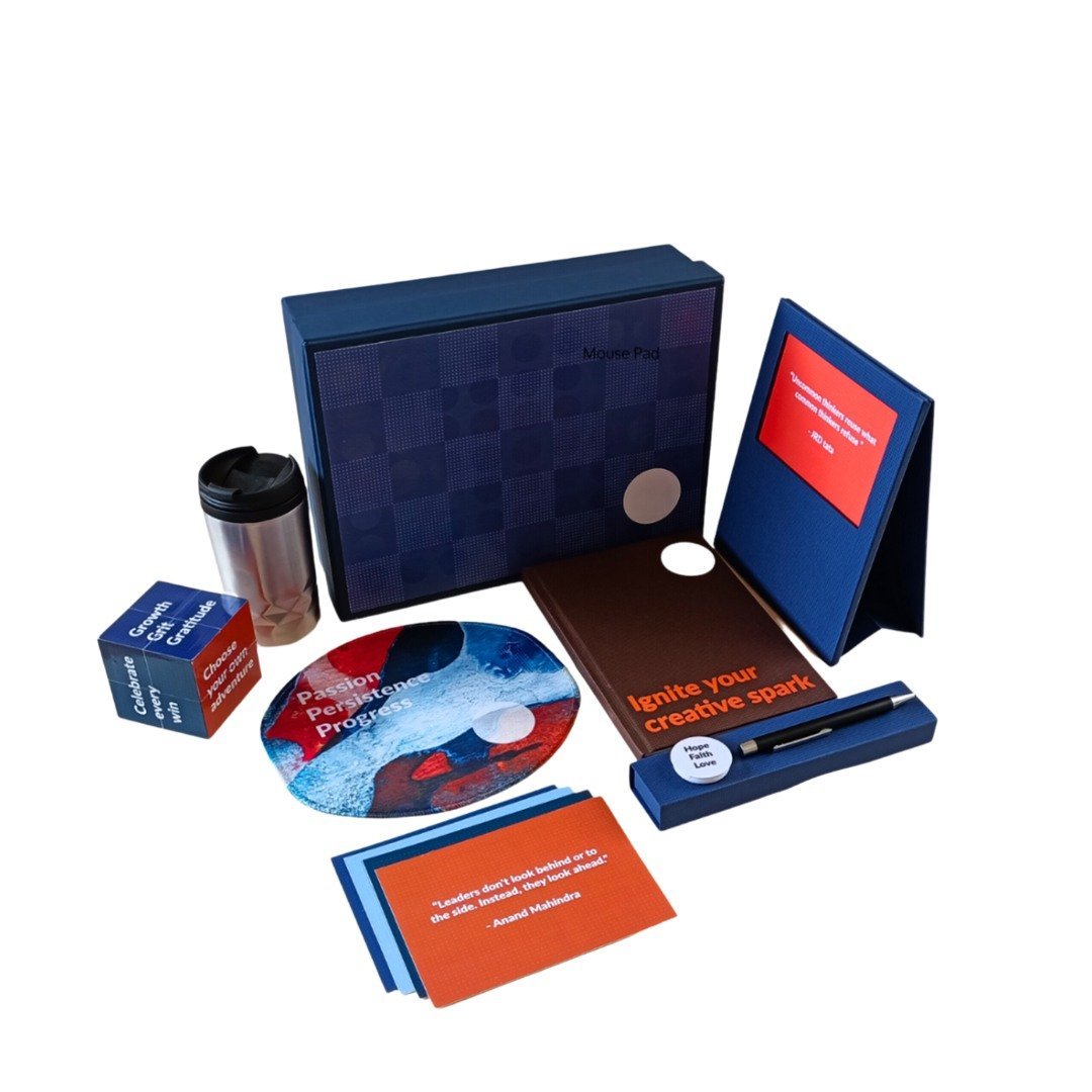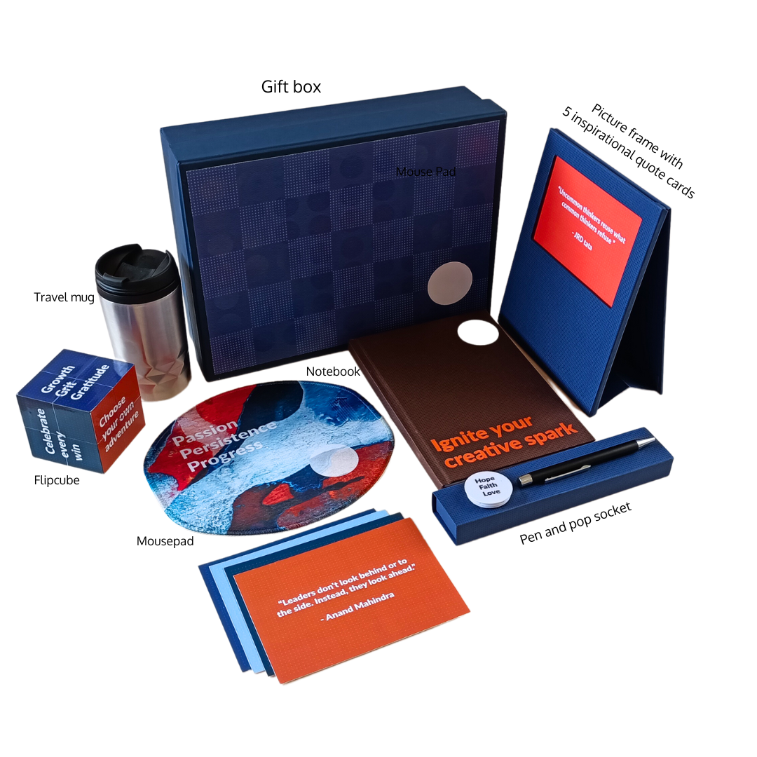 Enjoy fantastic, uplifting and heart warming quotes on life by famous Indian visionaries in a picture frame, allow the mouse pad to be a gentle reminder to stay inspired through all the work you do, enjoy sharing your ideas in the well designed journal, giving you space to doodle, write or simply jot what comes to mind, carry the language of inspiration on your phone, sip on your favourite beverage with this travel mug, and create small moments of joy each day.