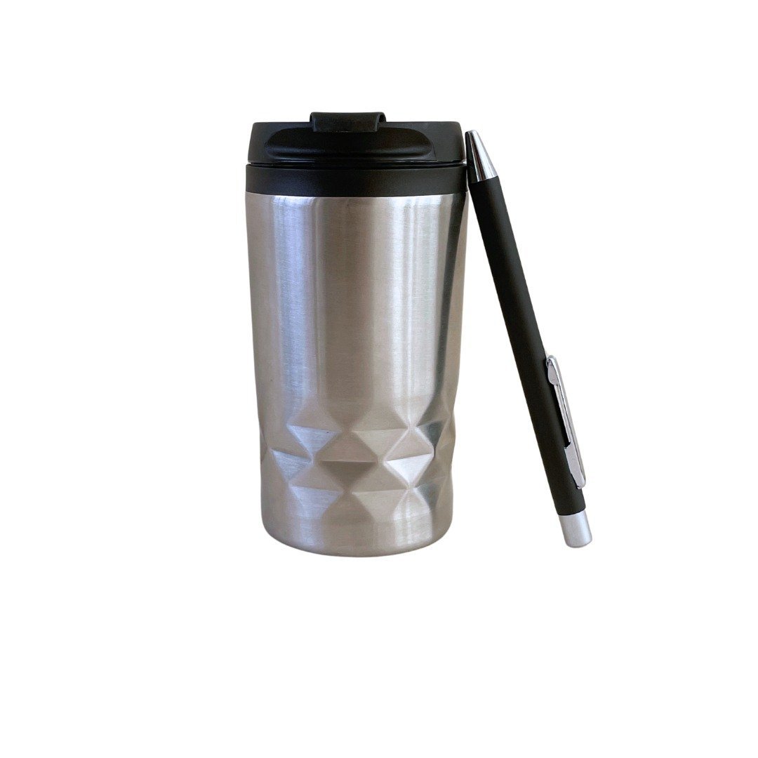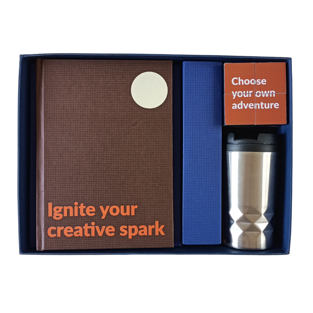 Contents – A5 notebook – 96 pages with rules, checks, dots and plain sheets, flip cube, travel mug, pop socket, pen, mouse pad, picture frame with 5 inspirational quotes.