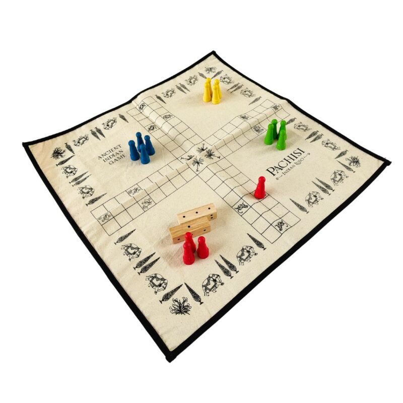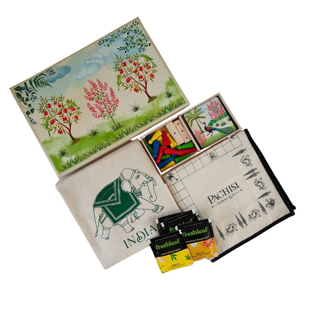 Contents: Premium box, Pachisi game with coins and dice, 4 coasters, 4 flavourful tea sachets and a tote bag