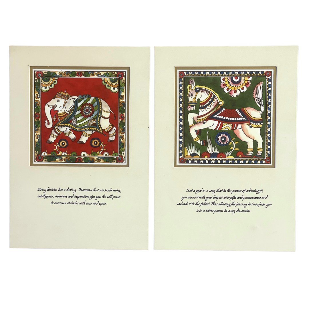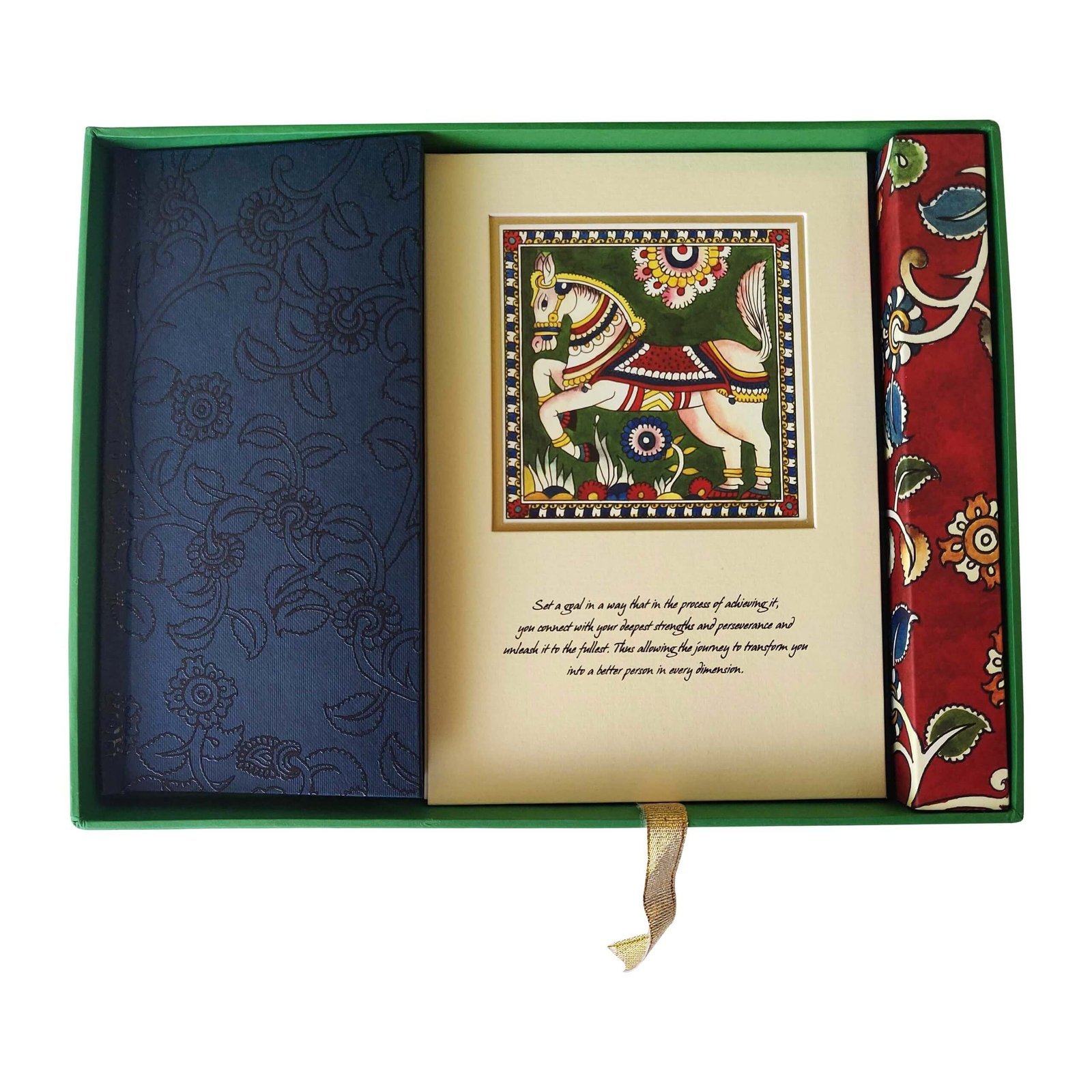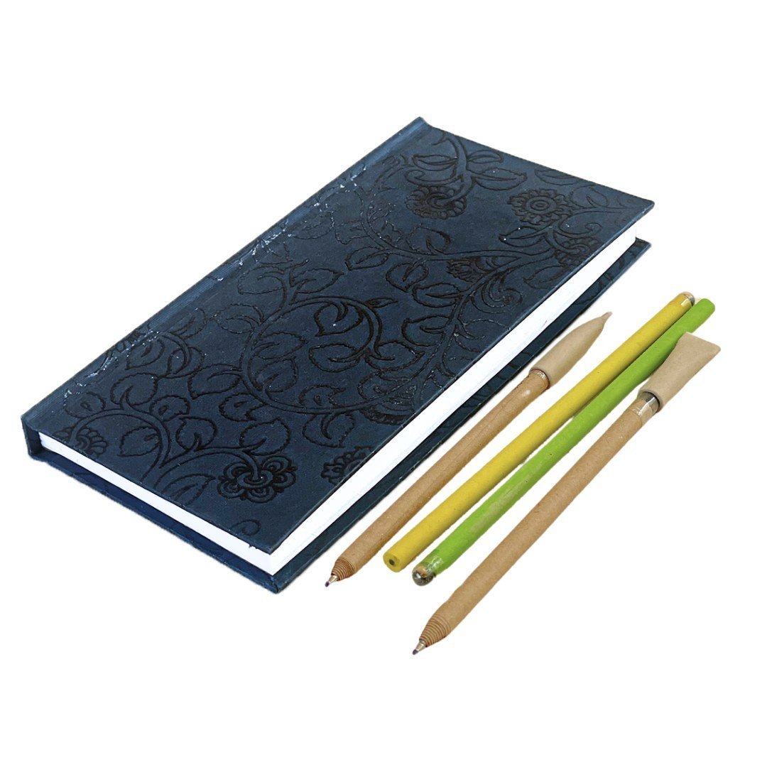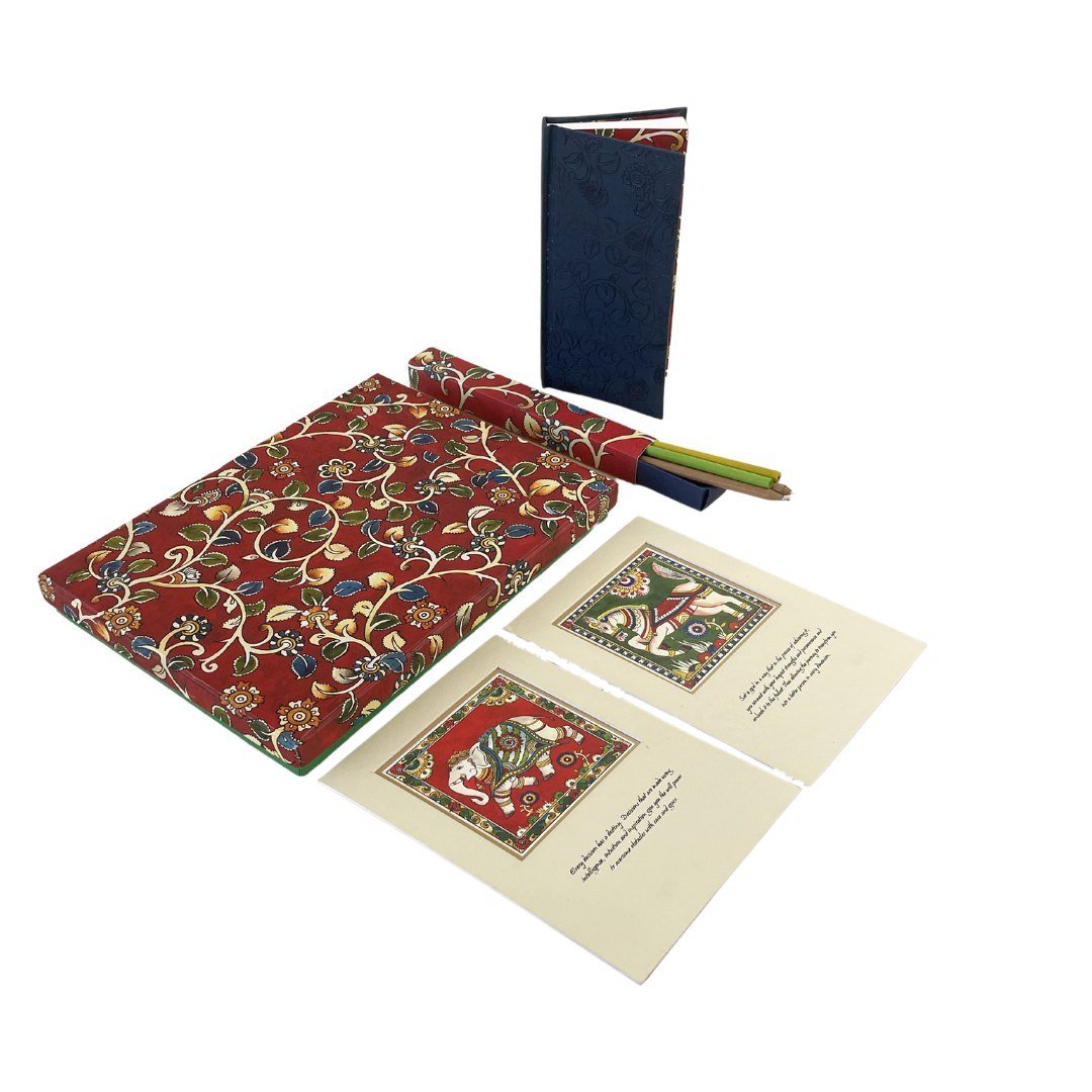 This Kalamkari Gift Set makes for a great gifting idea with simple reminders that inspire us to craft our lives, one goal at a time. It contains a sleek notebook to help you write your goals and journal your ideas, two ready to frame art prints with a gentle reminder to keep you inspired, find your strength and persevere on your journey, newspaper rolled pens to enjoy good writing, and seed pencils that can be sown after use to reap a beautiful plant.