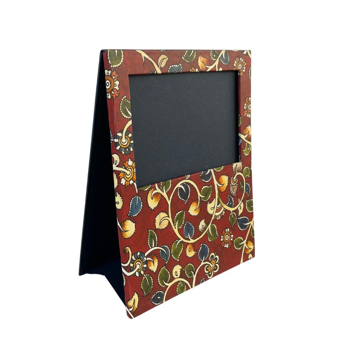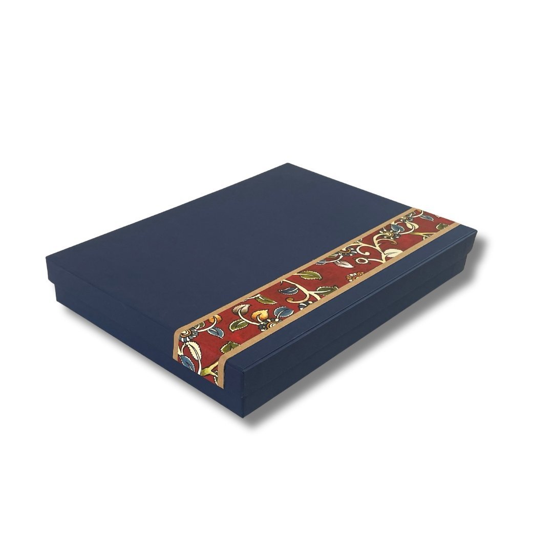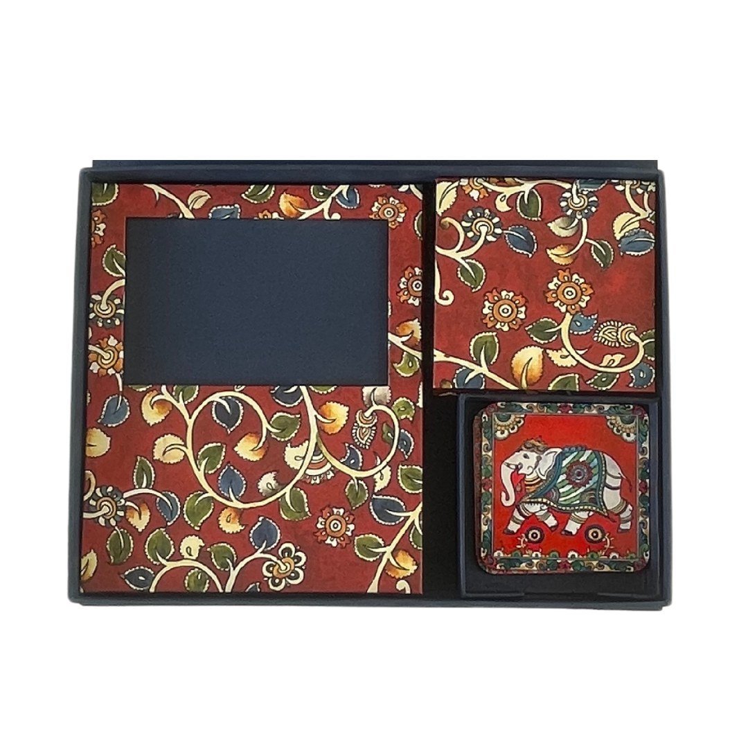 This gift set is inspired by the richness of Kalamkari, and is bound to make your workplace or home come to life with unusual elegance. A notebook to help you jot down your ideas and journal, a picture frame to forever cherish those happy moments, a memo box to help you write little notes, and aesthetically designed coasters to add some art to your tea time. The outer box makes a great place to collect keepsakes or store stationery.