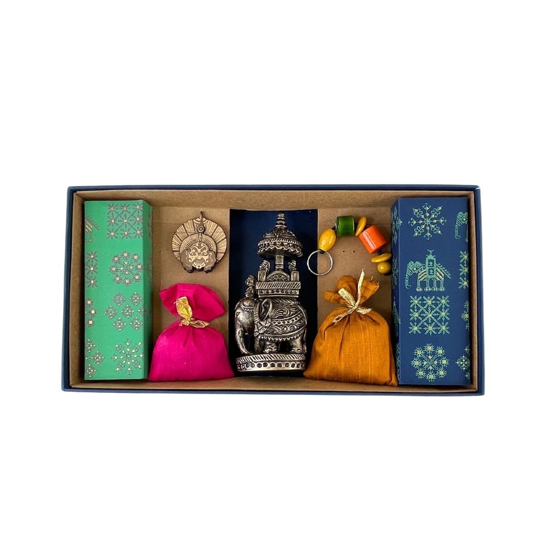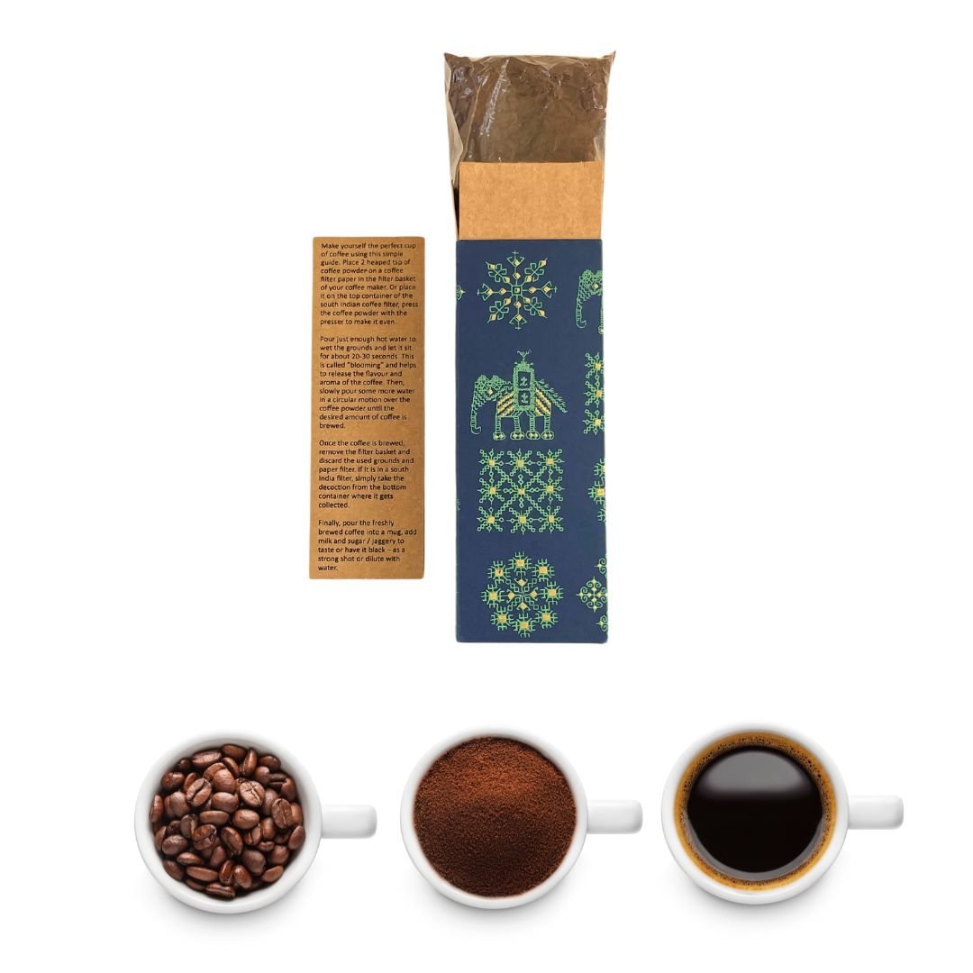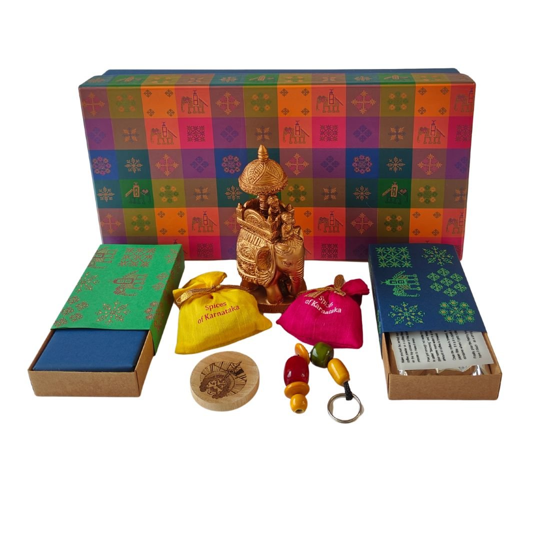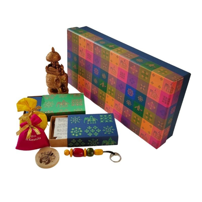 This vibrant set makes the perfect gift and comes packed with the world-famous aromatic filter coffee, freshly packed local spices, a Yakshagana magnet, and a beautiful ornately designed elephant, organic soaps with sandalwood fragrance, and a Channapatna wooden key chain. Each one is sure to charm you in different ways and will give you memories to savor long after the day has passed. The brightly colored outer box makes a great place to collect keepsakes or store stationery.