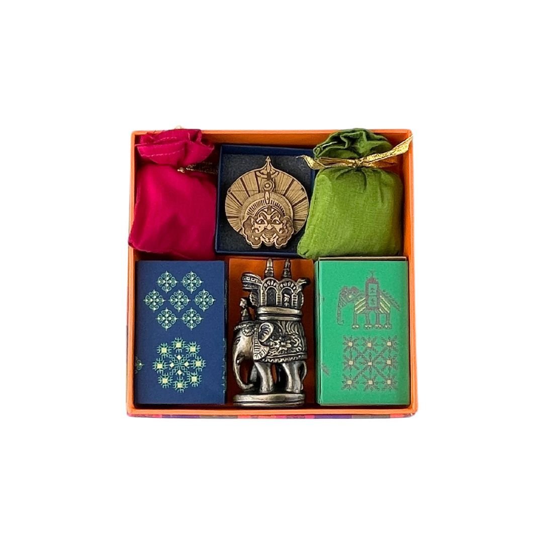 This vibrant set is inspired by the Kasuti art makes the perfect gift and comes packed with the world-famous aromatic filter coffee, freshly packed local spices, a yakshagana magnet, and a beautiful ornately carved wooden elephant (from Mysuru), organic soap with sandalwood fragrance, and filter coffee. Each one is sure to charm you in different ways and will give you memories to savour long after the day has passed. The brightly colored outer box makes a great place to collect keepsakes or store stationery.