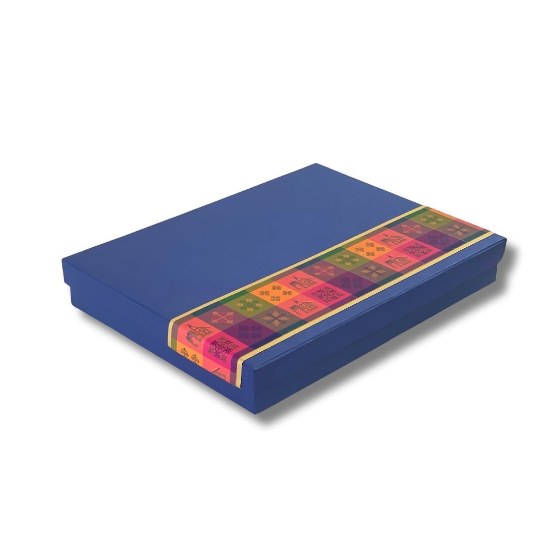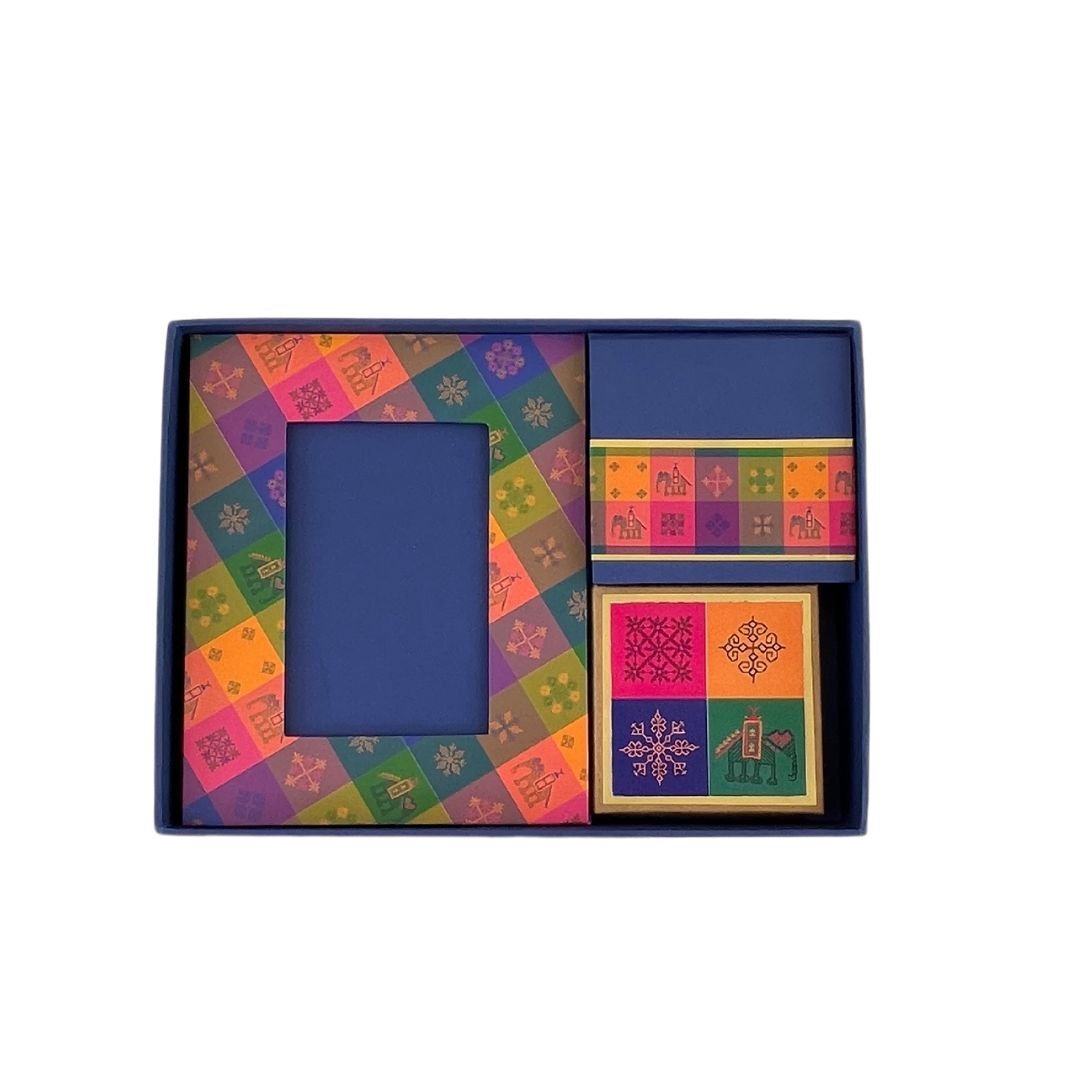 This Kasuti Gift Set makes for a great gifting idea. A notebook to help you jot down your ideas and journal, a picture frame to forever cherish those happy moments, a memo box to help you write little notes, and coasters with beautiful motifs to add delight to your tea time. The outer box makes a great place to collect keepsakes or store stationery.