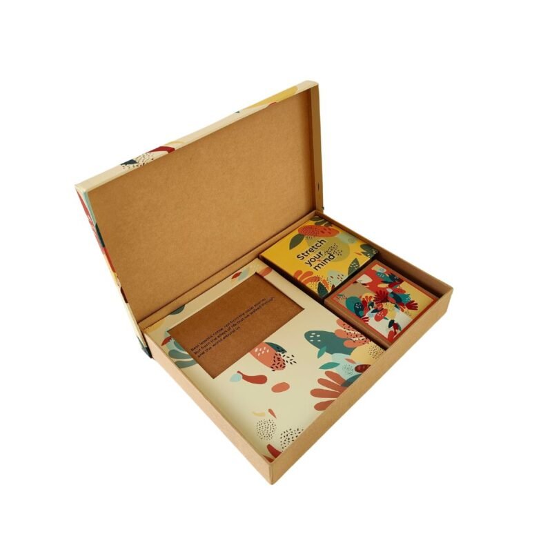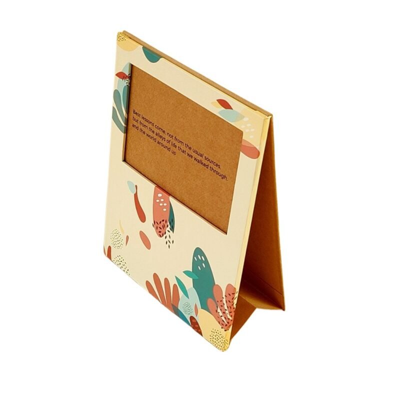 This gift set is an unusual one that will leave the recipient feeling delighted. A notebook to help you jot down your ideas and journal, a picture frame to forever cherish those happy moments, a memo box to help you write little notes and coasters with a splash of colors and messages to make your tea time a delightful one. The outer box makes a great place to collect keepsakes or store stationery.