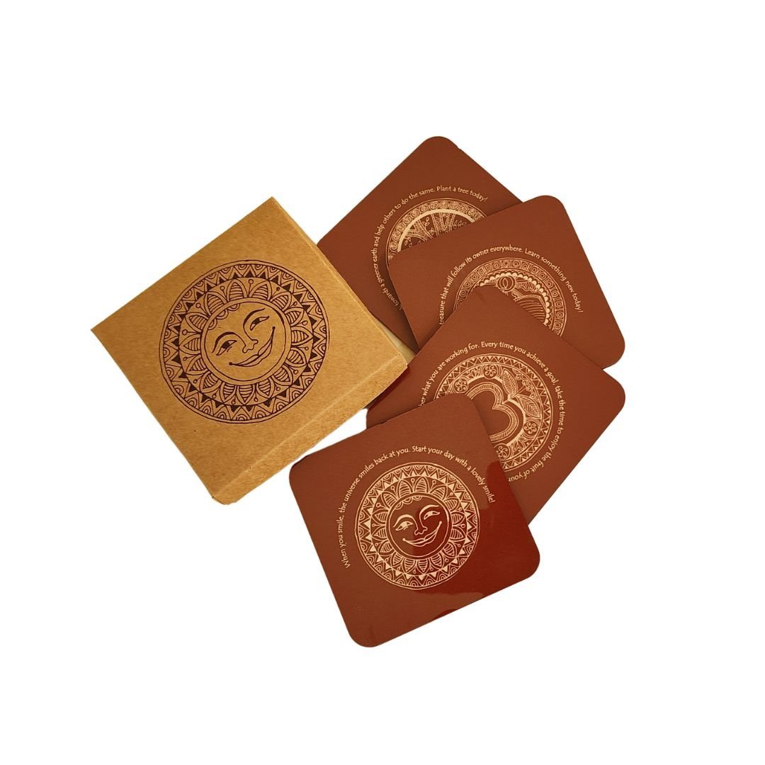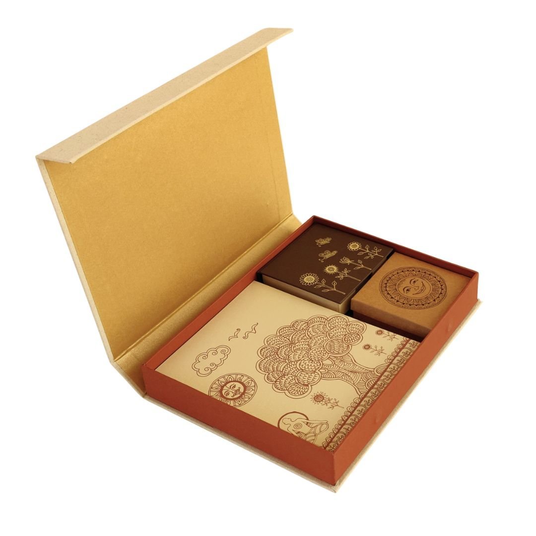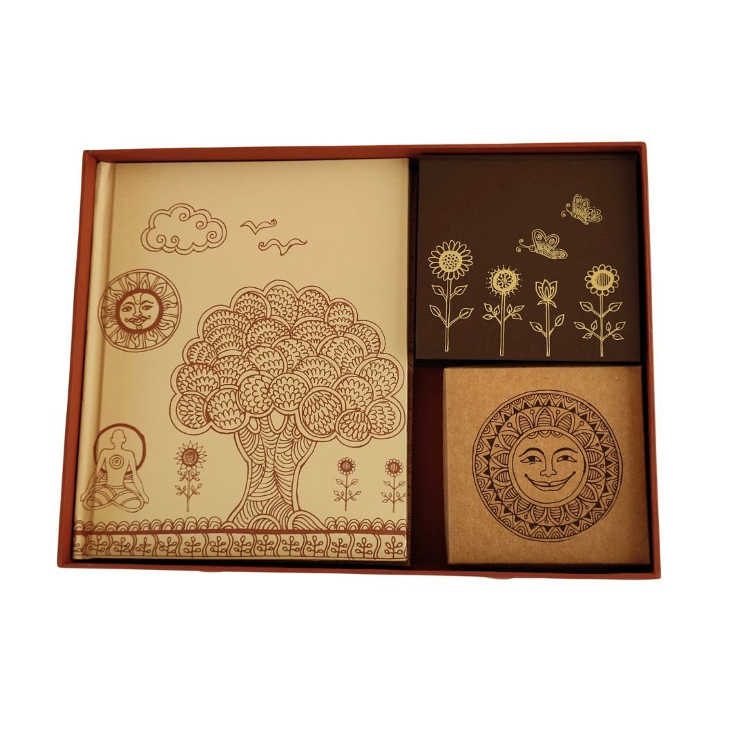 This gift set is bound to make your workplace or home come to life with unusual elegance. A notebook to help you jot down your ideas and journal, a picture frame to forever cherish those happy moments, a memo box to help you write little notes, and aesthetically designed coasters with positive one-liners to uplift your spirits and to add some art to your tea time. The outer box makes a great place to collect keepsakes or store stationery.