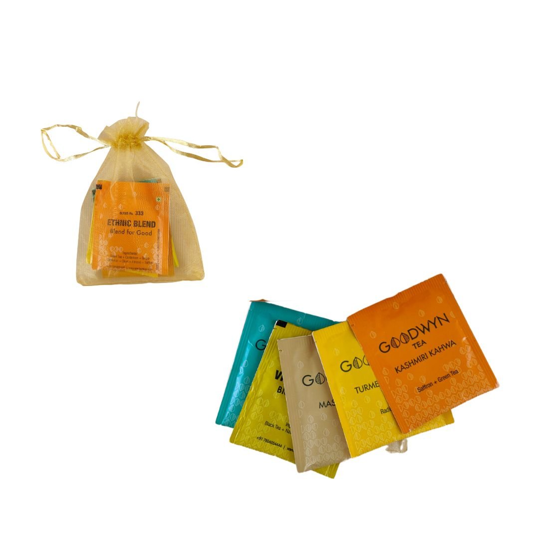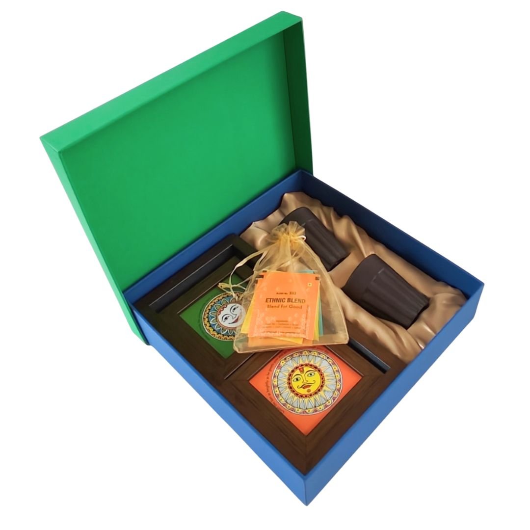 Contents: 2 cutting chai cups, 5 flavoured chai sachets, 1 tray and 2 coasters.