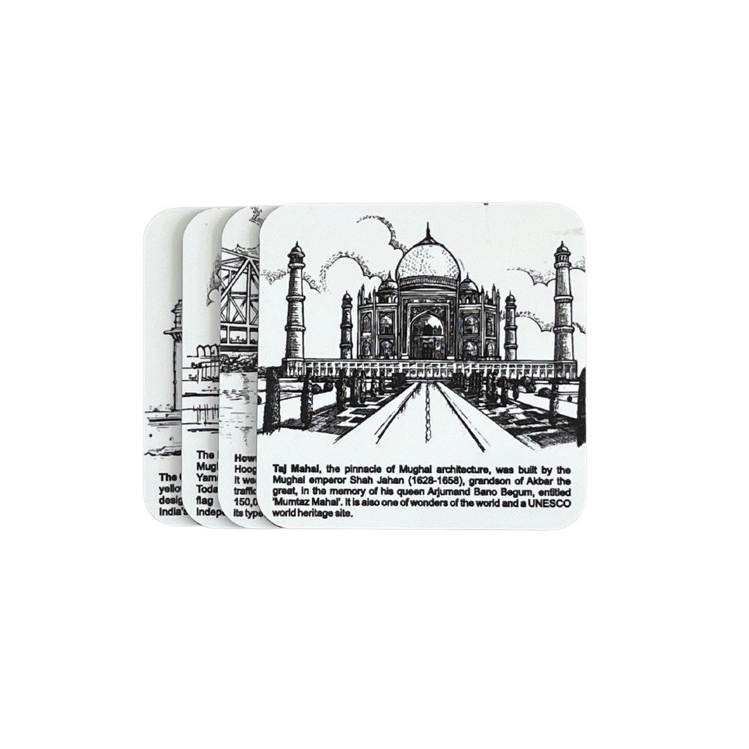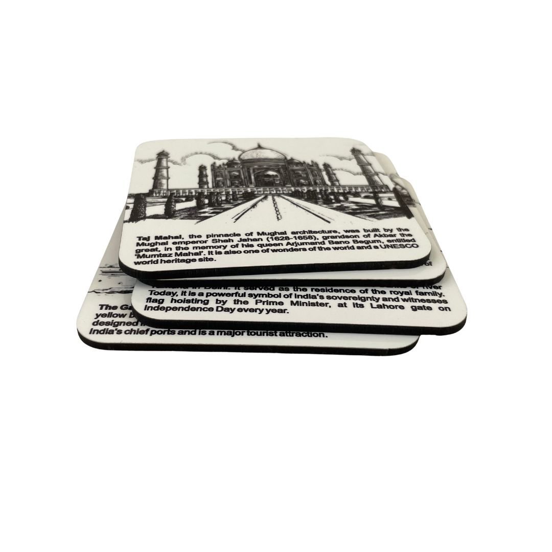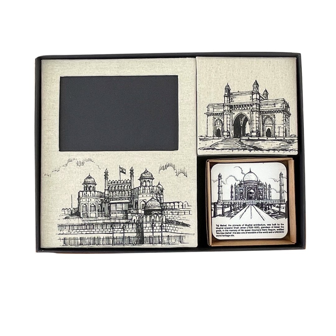 This souvenir set is an apt gift dotted by magnificent landmarks of India with snippets of history as an extra charm. A notebook to help you jot down your ideas and journal, a picture frame to forever cherish those happy moments, a memo box to help you write little notes, and coasters with beautiful landmarks to make your tea time a more delightful one. The outer box makes a great place to collect keepsakes or store stationery.
