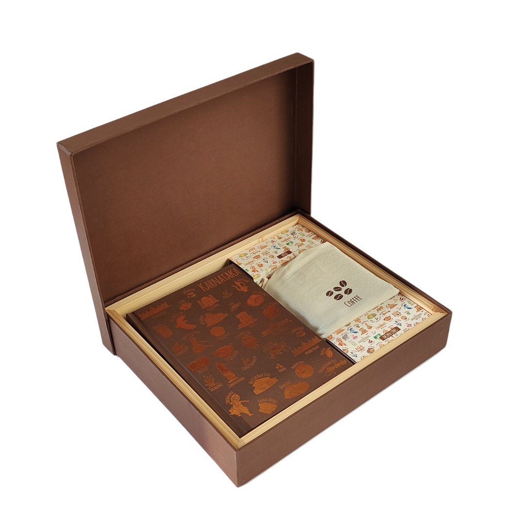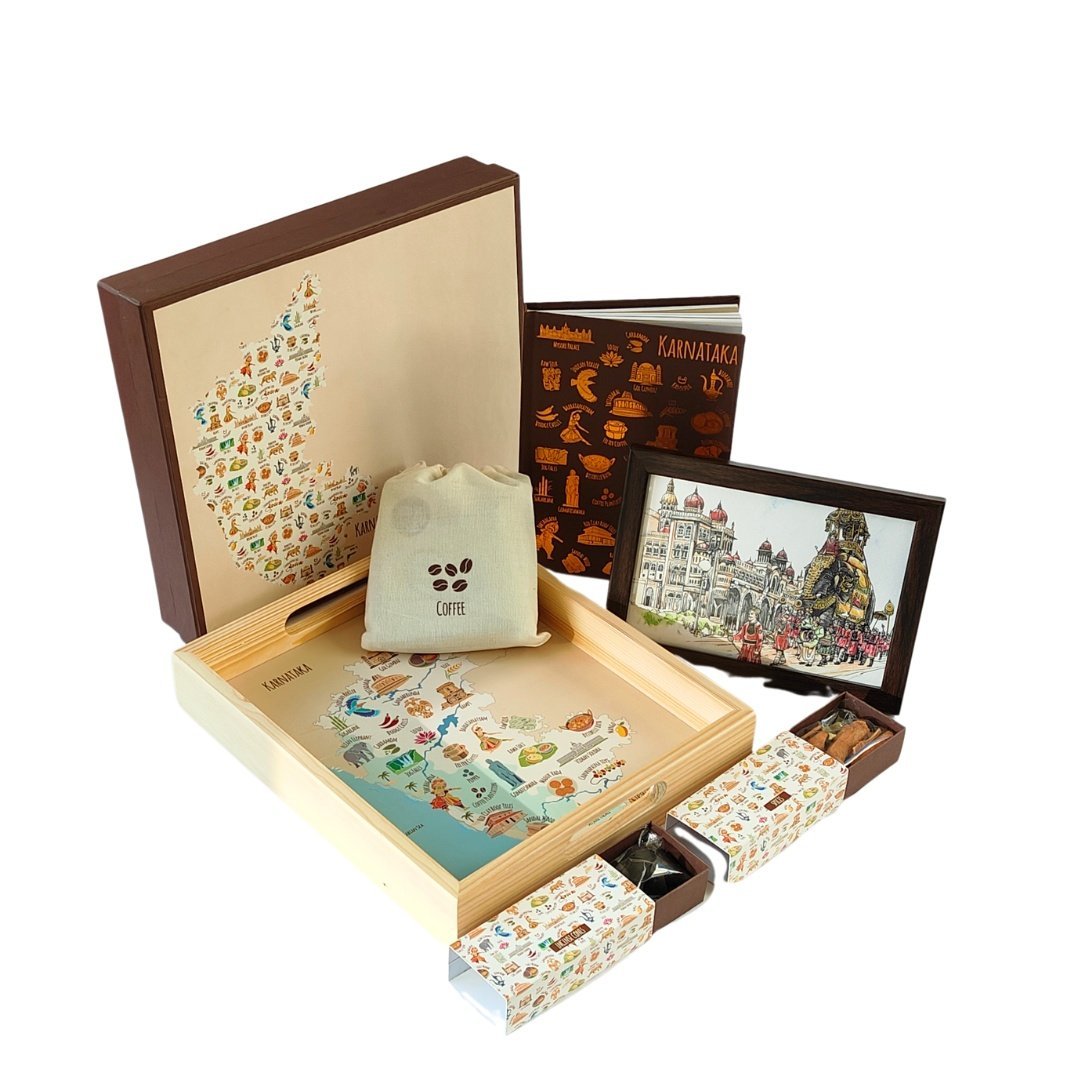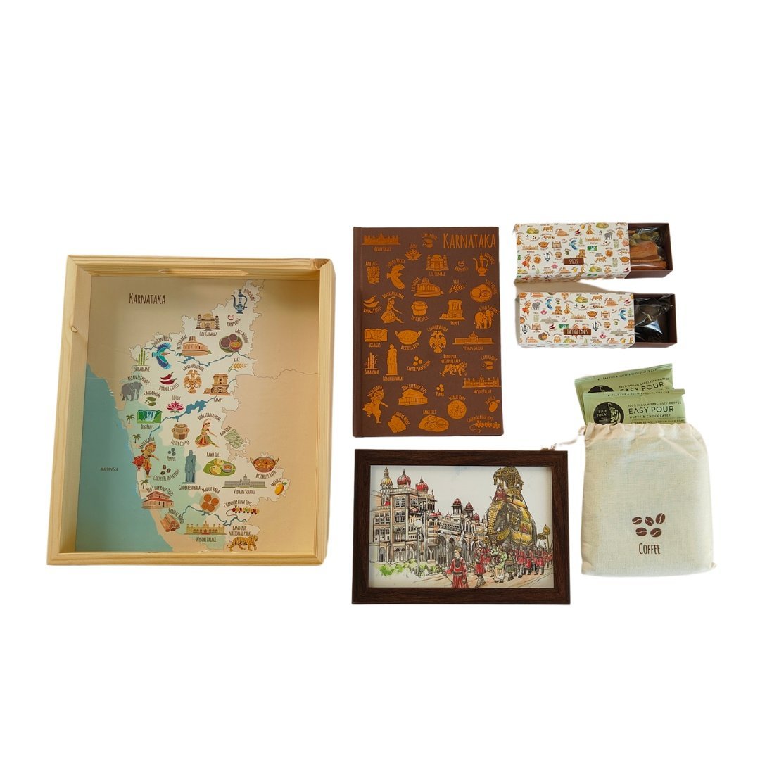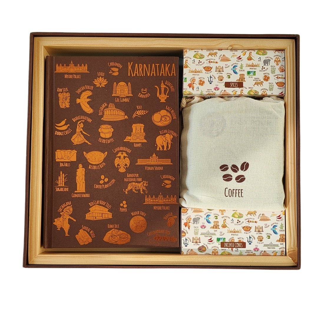 Contents include – Aromatic coffee, fragrant incense cones, handpicked spices, a beautifully crafted notebook with 3 interesting separators, and a canvas frame featuring a renowned landmark and wooden tray with the Karnataka map. A perfect gift that captures the spirit, artistry, and traditions of Karnataka.