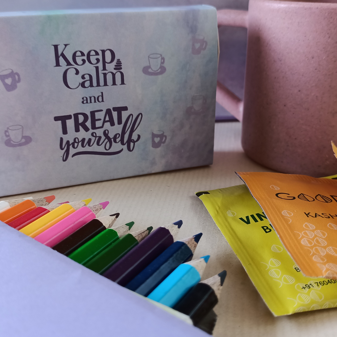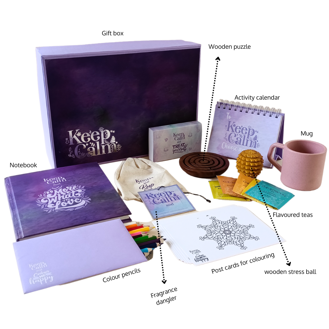 Bring back the magic of colouring with artistic postcards and colour pencils—pick one at random and immerse yourself in its hues. Use the calming activity calendar as your daily inspiration for self-care, and enjoy the comforting touch of the stress ball that doubles as an acupressure tool for tired hands and feet.